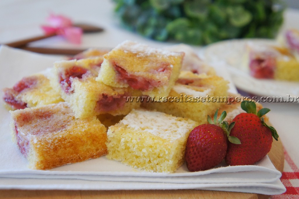 5- Em uma forma quadrada, untada com papel manteiga (unte antes e depois de colocar o papel), adicione a massa, alisando bem e por cima siga adicionando os morangos, de forma aleatória dando uma leve apertadinha.