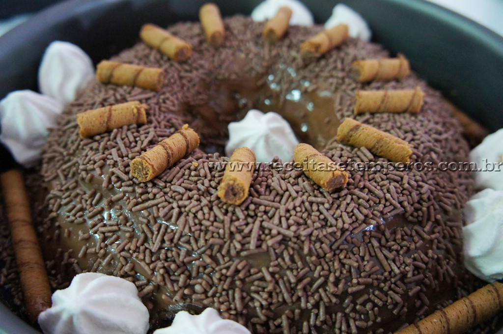 4- Desenforme ainda morno, salpique granulado e leve a geladeira por 6 horas.